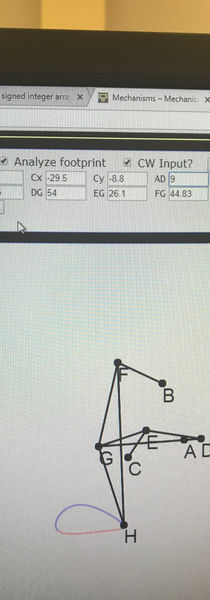 The Klann leg lengths we chose to implement took a while to perfect. The first way I worked on them was using complex calculations and paths found in several extremely technical documents online. The foot path created by those lengths did not have a smooth flat bottom, far from ideal. Thanks to the website linked below there was an easier way to simulate the leg mechanism and change the leg lengths and see the generated path. Further issues appeared after using the second iteration of leg lengths because the thickness of the legs, made of real material, interfered with the motion of the leg. The simulation legs were lines with no thickness. With these past mistakes in mind, I used the simulation to generate a good leg path keeping potential interference zones in mind. From there I created the links in CREO and traced the path with that software to see if the path matched the simulation and also to make sure that there were no interference issues. From there I modeled the simulation using our link lengths and leg mechanism working form the Matlab script template given to us by our TA Brian McGuigan. The Matlab results are displayed more in depth on the corresponding page.